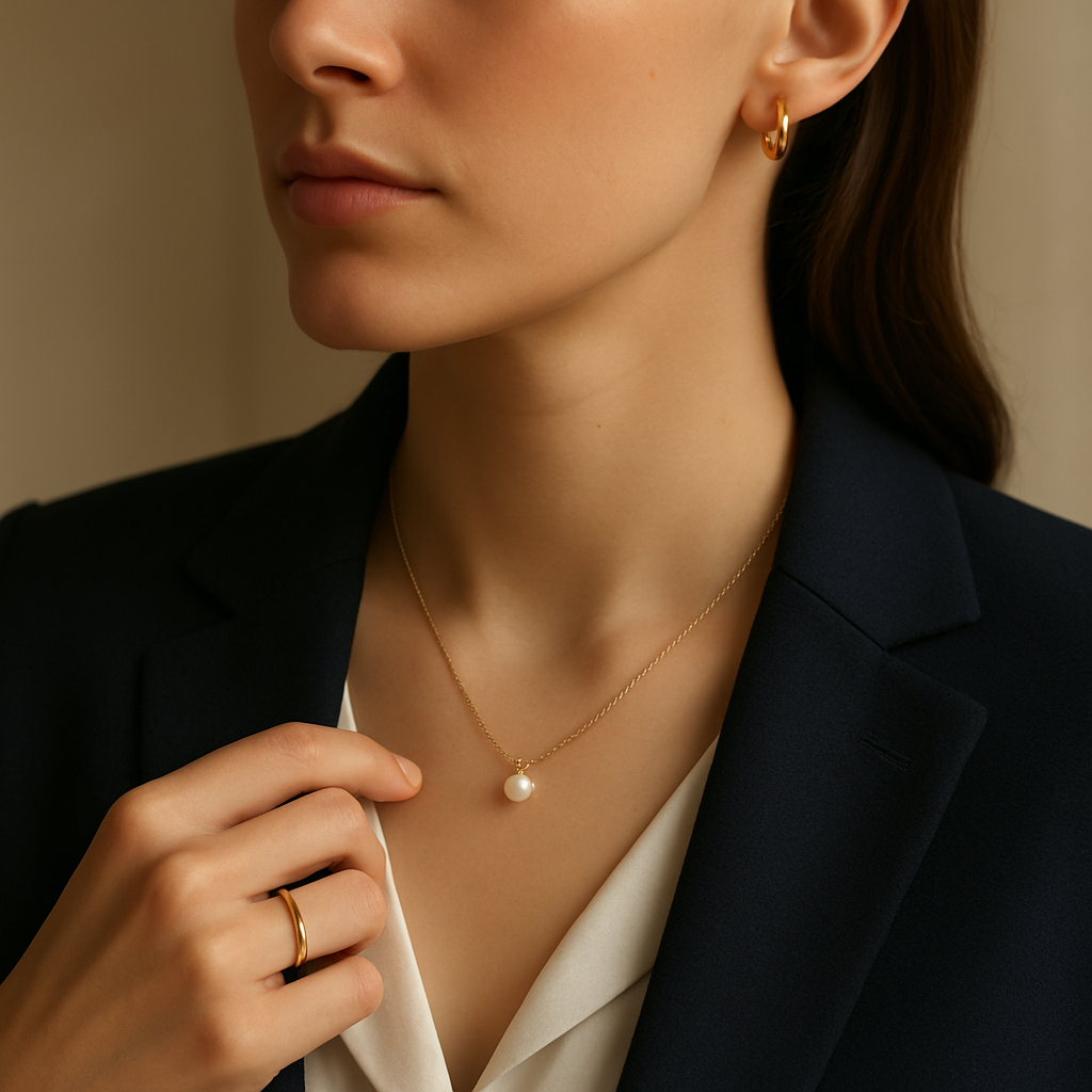 Eine zarte Halskette, ein Paar kleine Ohrringe (Stecker oder Creolen), ein schlichtes Armband und ein schlichter Ring sind ein gutes Grundsetup. Diese Basis lässt sich leicht variieren und mit auffälligeren Stücken ergänzen.